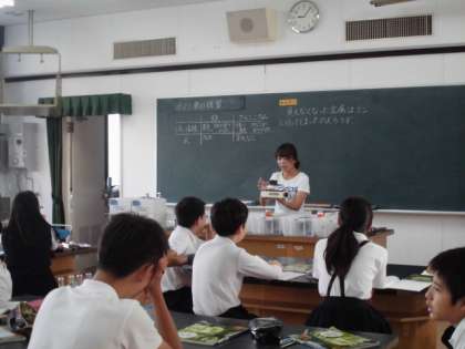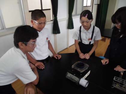 うすい塩酸に鉄を溶かした水溶液を蒸発させると何が残るか、実験をして調べました。安全のためゴーグルをかけています。