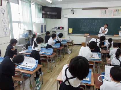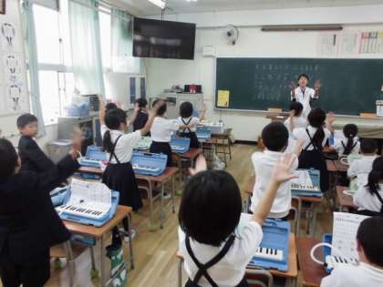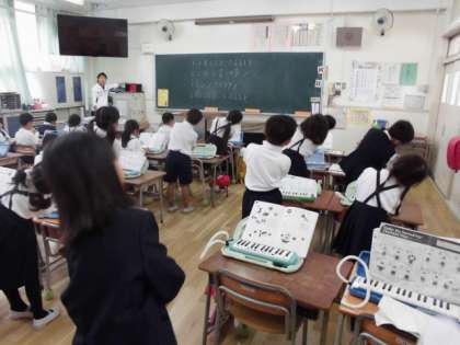 半分がけん盤ハーモニカを演奏し、半分が振りをつけて踊っていました。みんな英語の歌詞で歌っていました。