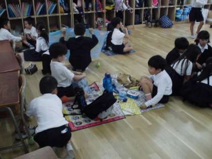 遠足が延期になってしまいましたので、お弁当は学校で食べました。27日がいいお天気だといいですね。