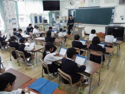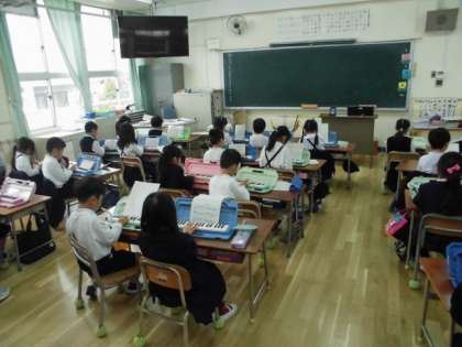 今日、1組と2組では、「きらきらぼし」と「大きなくりの木の下で」をけん盤ハーモニカと英語の歌での演奏をしていました。