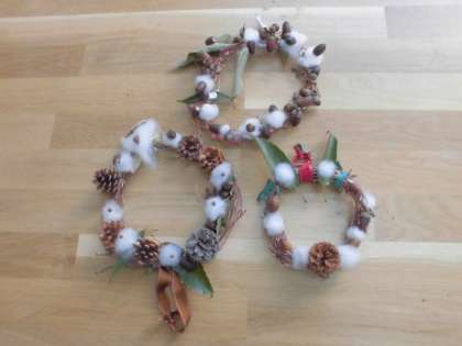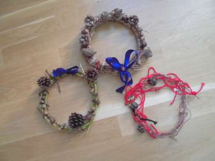 自分で育てたアサガオのつるや、遠足で拾ってきたドングリ、マツボックリなどをつかってクリスマスのリースを作りました。