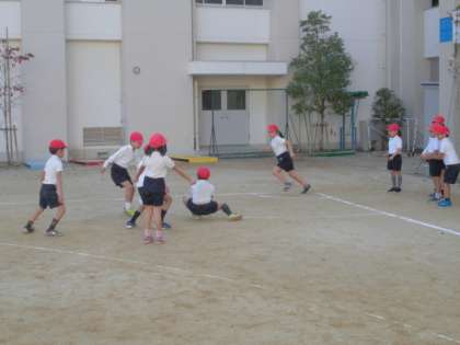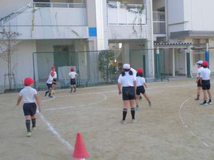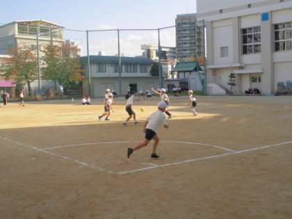 3年生のベースボール型ゲームは、キックベースボールです。ボールを蹴るのも、守るのも、ルールも難しいゲームですが、みんな楽しそうにやってました。