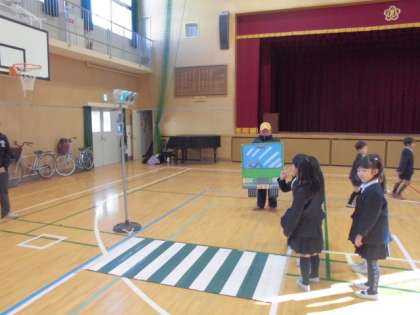 1〜3年生が2時間目に,4〜6年生が3時間目に「交通安全指導」を受けました。大阪府警本部から警察官にお越しいただき,クイズをしたり模擬道路を歩いたりして,交通事故に合わないための勉強をしました。