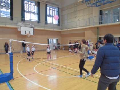 講堂で風船を使ってバレーボールをしました。子ども達は結構上手で、お家の人にも負けていませんでした。