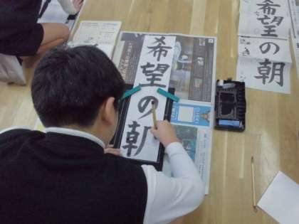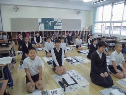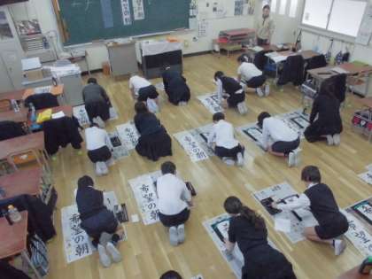 書き初めということで,いつもとは違って床で書きました。みんな少し緊張しているようでした。