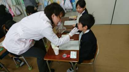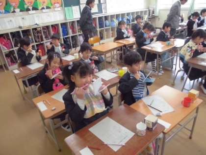 歯科校医の尾辻先生と歯科衛生士の先生に来ていただき,歯磨きの指導をしていただきました。歯はとても大切です。上手にみがけるようになってくださいね。