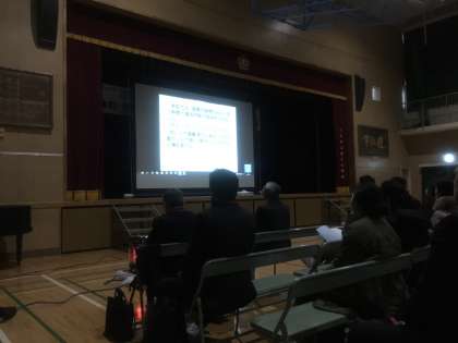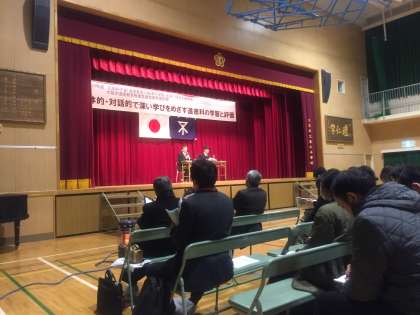 講堂での全体会では,本校の研究発表の後,浅見哲也文部科学省調査官と服部校長の対談が行われました。