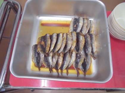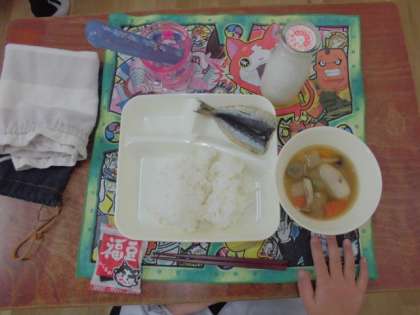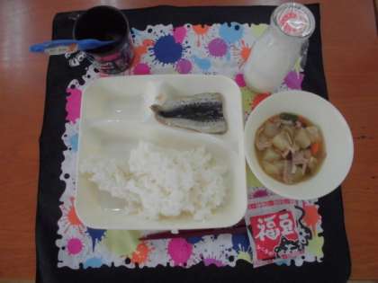 今日は,「節分の行事献立」で,いわしのしょうがじょうゆがけ,含め煮,いり大豆でした。豆まきはしませんでした。