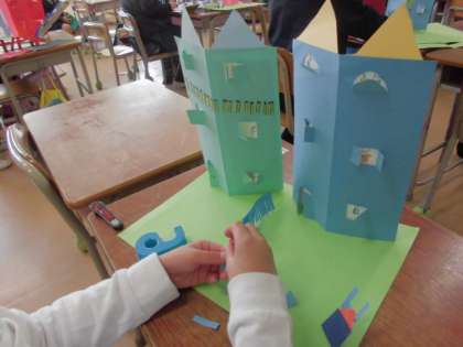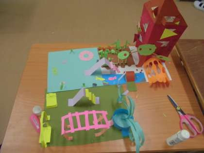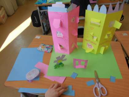 色画用紙で作った建物にカッターナイフで窓を開けて建物を作りました。それを台紙に立てて,周りの庭や公園なども上手に作っています。