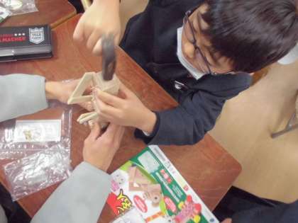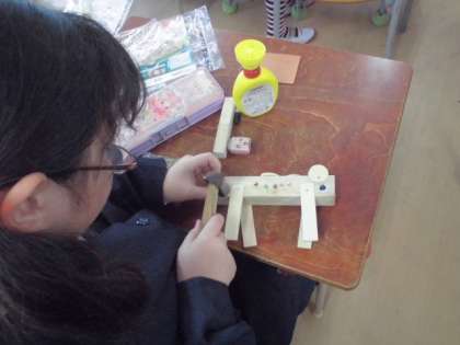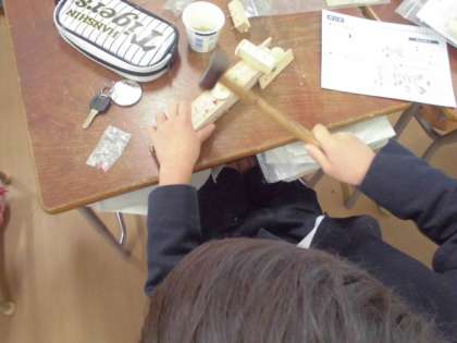 木をつかった工作です。金づちを使ってくぎを打っていきます。あまり経験のない作業なので、釘が歪んでしまったり,時に指をたたいたりしていました。でも、なかなか上手でした。