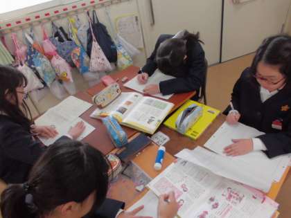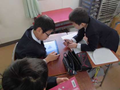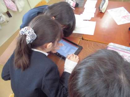 説明文「和の文化を受けつぐ」の発展学習として,グループに分かれて日本の文化について調べています。調べているのは「すし」「楽器」「仏教建造物」「着物」「行事」「刀などの鉄でできた道具」の6種類です。参観日に発表会をします。