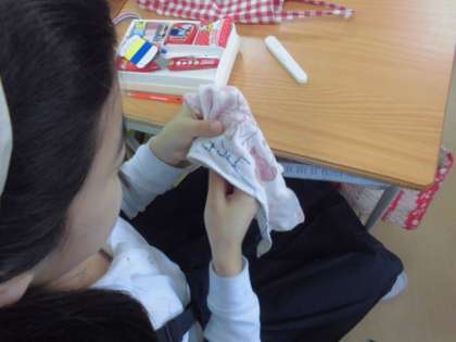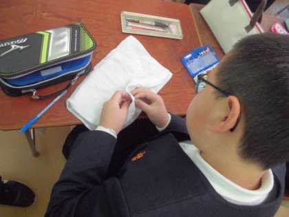 まず,針と糸で自分の名前を縫います。その後で,ミシンを使ってぞうきんに仕上げます。6年生で自分が使うぞうきんです。
