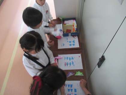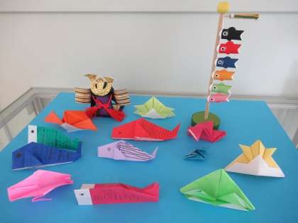 下の写真は、校長室前で児童がかぶとやこいのぼりを折り紙で折ってくれました。上手に折っていました。