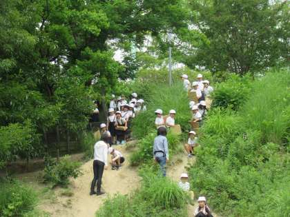 山を滑り降りる児童や、草花で遊ぶ児童、土を掘り虫を探す児童、ドッヂボールや縄跳びをする児童など、広い場所でたっぷりと体を動かし遊びました。