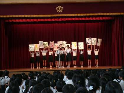 昨日の全校朝礼で図書委員が全校児童に呼びかけました。