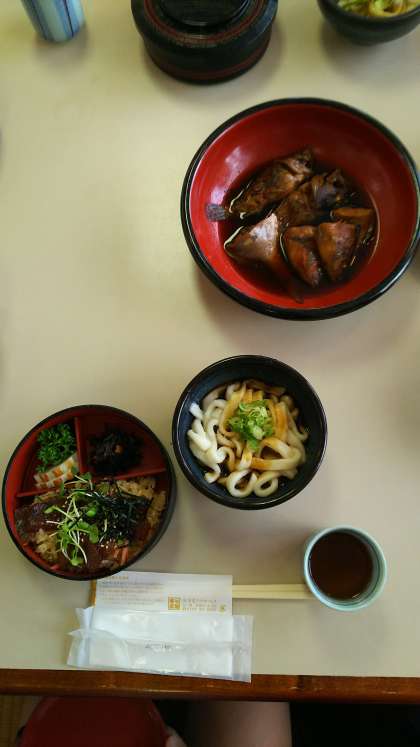 お昼です。伊勢のうどんと手こねすし、昨日釣った魚の煮付けです。