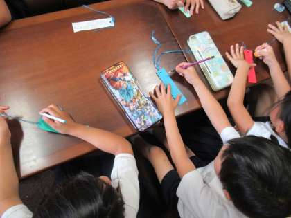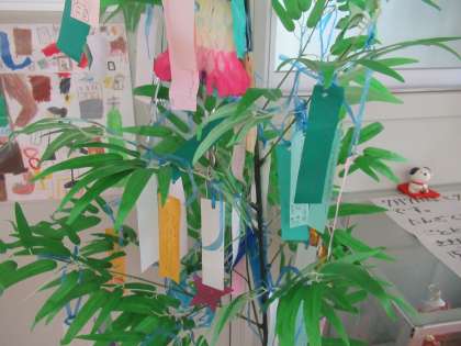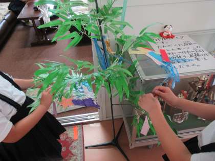 校長室前に笹を準備しました。「願いごと」を書きたい子どもは校長室で書きました。その短冊を高学年が笹につけてくれました。