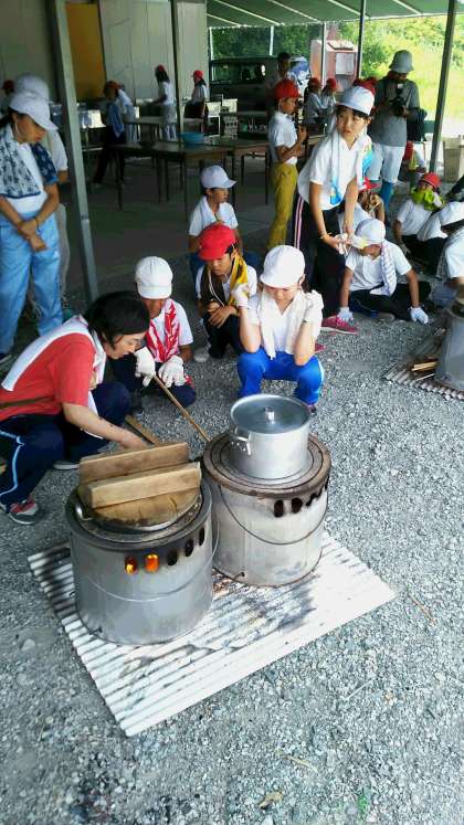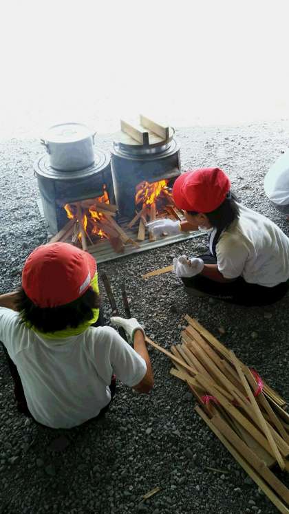 飯ごう炊さんです。かまどに火がつきました。