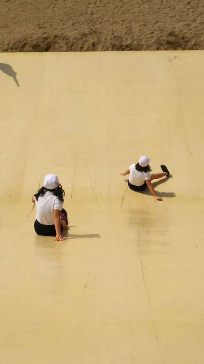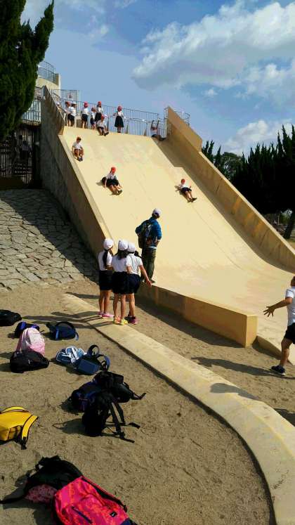 大泉緑地に着き、大きな滑り台や長い滑り台、ブランコなどで楽しく、満喫しています。