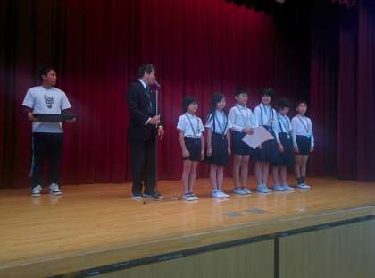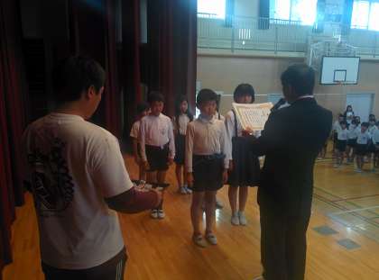 今朝の児童朝会では、昨日の北区民カーニバル小学生リレー(4・5・6年生)の表彰を行いました。