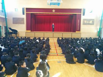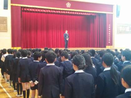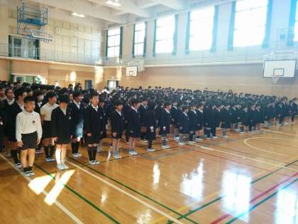 講堂に全校児童が集まり始業式が行われました。3学期は学年のまとめと、次の学年、6年生は中学校に向けての準備の学期です。