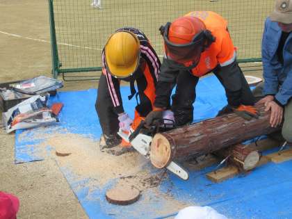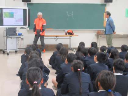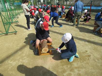 今週の12日の火曜日に講師の先生にご来校いただき、5年生が林業体験を行いました。1時間は多目的室で話を聞きました。さらに1時間を使い、学年代表で2名の児童がチェーンソーで丸太を切り、その後、全員がのこぎりで丸太を切りました。切った丸太は家にお土産として持ち帰りました。コースターや鍋しきに使用してください。校長室は花台として使っています。子どもたちはしんどかったようです。