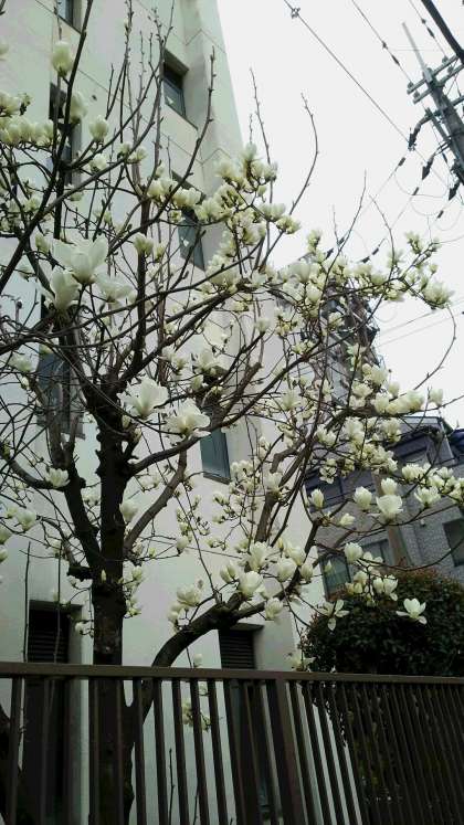 校庭にはもくれんが、前の長柄公園にはさくらが咲いてきています。春を感じます。