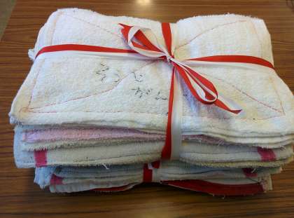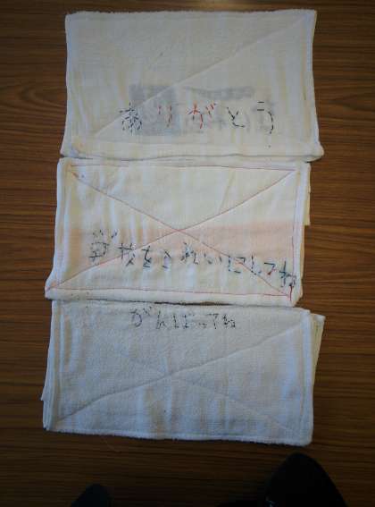 卒業生からメッセージの入りのぞうきんが3月に贈られました。