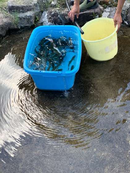 高原遊びの後は、魚つかみとキーホルダー作りをしました。水温が高く、魚も弱っていました。キーホルダーは自分の好みの飾り付けをしていました。