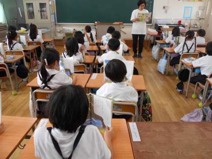 先生が読んだ後にみんなで声を合わせて読んだり、列ごとに読んだりしました。