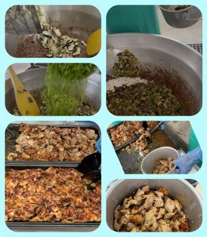 「鶏肉のてり焼き」は、鶏肉に料理酒、砂糖、みりん、濃口しょうゆで下味をつけ、焼き物機で焼きます。