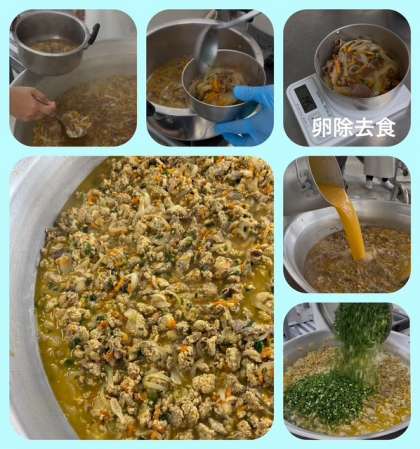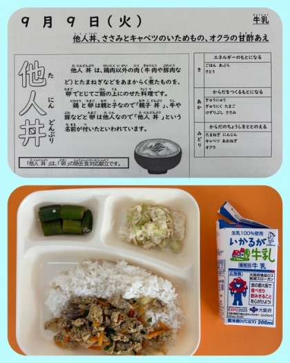 「他人丼」は、牛肉、たまねぎ、にんじんなどの野菜を甘辛く煮て、青みに青ねぎを加えて卵でとじた具をごはんにかけます。この献立は卵の除去食対応献立です。