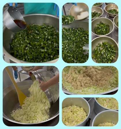 「オクラの甘酢あえ」は、焼き物機で蒸したオクラに砂糖、塩、米酢、薄口しょうゆで作ったタレをかけ、あえます。