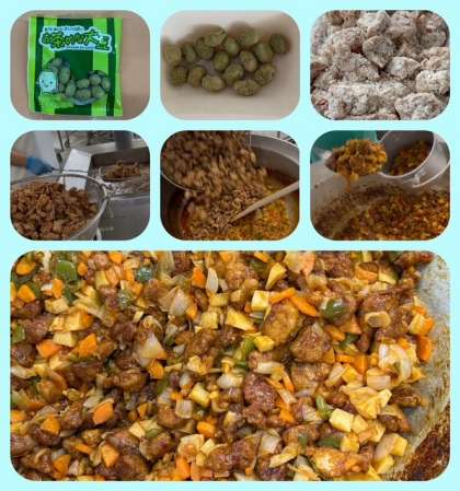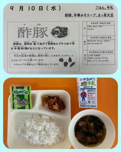 「酢豚」は、たまねぎ、たけのこ、にんじん、ピーマンをいため、甘酢あんで味つけし、でん粉をまぶして油であげた豚肉(角)を加えます。