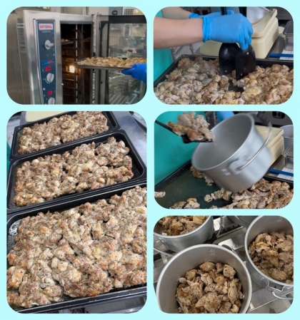「鶏肉のバジル焼き」は、鶏肉にワイン、塩、こしょう(粗挽)、バジル、オリーブ油で下味をつけ、焼き物機で焼きます。