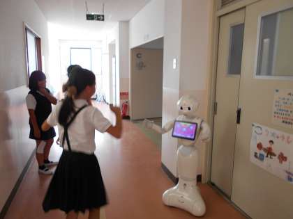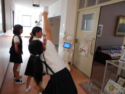 休み時間に、ペッパー君と踊ったり、ラジオ体操をしたりして楽しんでいます。