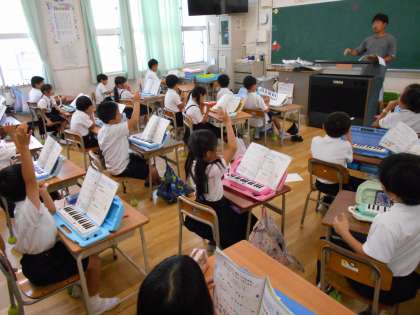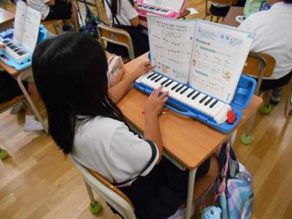 2年生の音楽科では「かっこう」を鍵盤ハーモニカで演奏します。みんな楽譜を見ながら練習しています。