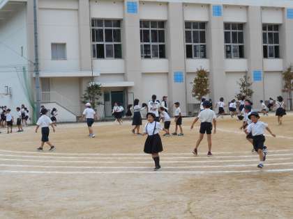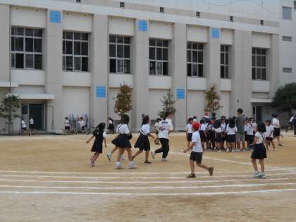 昼休みには、運動場でたくさんの人が遊んでいました。