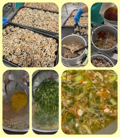 「中華みそスープ」は、鶏肉、チンゲンサイ、もやし、にんじん、コーン、しいたけを使用し、こしょう、薄口しょうゆ、赤みそ、中華スープの素で味つけします。