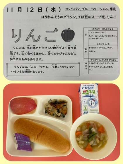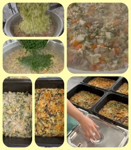 「ほうれんそうのグラタン」は、鶏肉、たまねぎ、ほうれんそう(冷凍)、マカロニを使い、こしょう(白)、ローレル、野菜ブイヨン、シチュールウの素、上新粉などで味つけしてミニバットに入れ、パン粉をふって焼き物機で焼きます。