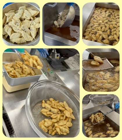 「白身魚フリッター」は、冷凍のまま170度のなたね油で揚げます。
