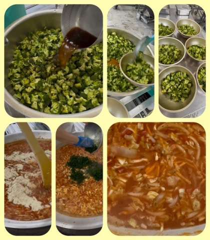 「ミネストローネ」は、鶏肉、キャベツ、たまねぎ、トマト(缶)、にんじん、にんにく、彩りにパセリを使用し、オリーブ油、トマトピューレ、砂糖、塩、こしょう、ローレル、薄口しょうゆ、チキンブイヨンで味つけします。