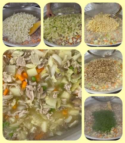 「豚肉と野菜のスープ煮」は、豚肉、じゃがいも、たまねぎ、キャベツ、にんじん、マッシュルーム、彩りにグリンピースを使用し、塩、こしょう、薄口しょうゆ、チキンブイヨンで味つけします。
