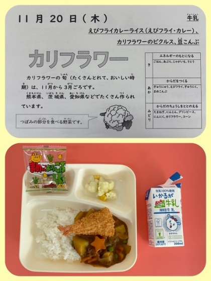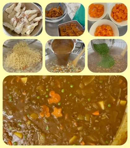 「えびフライカレーライス(カレー)」は、牛肉を主材に、じゃがいも、たまねぎ、にんじん、グリンピース、にんにくを使用したカレーライスです。ミッキー型と星型のラッキーにんじんが入っています。