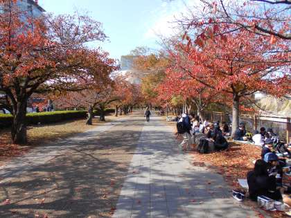 昼食はすっかり紅葉した大阪城公園で