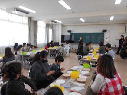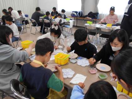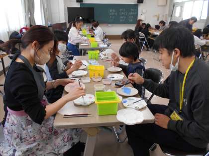 今日は、PTA主催による絵付け体験教室がありました。1部と2部にわかれ、たくさんの人が参加しました。用意されたお皿に思い思いの絵を下書きし、顔料である絵具で色をつけ仕上げました。あらかじめどんな絵を描くか準備をしてきている人もいました。今日絵付けしたお皿は、1月の中旬ごろに仕上がるそうです。どんなお皿になったのか、とても楽しみですね。