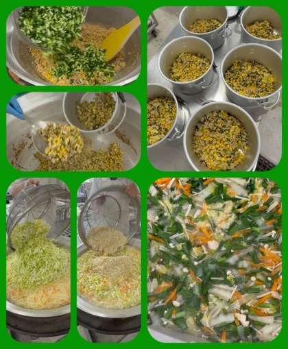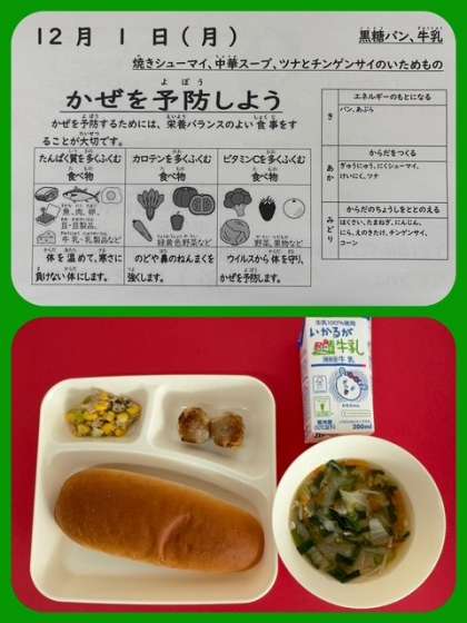 「中華スープ」は、鶏肉、はくさい、たまねぎ、にんじん、えのきたけ、青みににらを使用し、塩、こしょう、薄口しょうゆ、中華スープの素で味つけします。