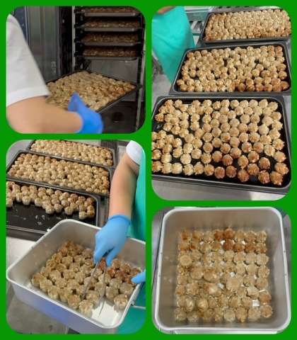 「焼きシューマイ」は、冷凍の肉シューマイをホテルパンに並べ、焼き物機で蒸し焼きにします。1人2個ずつです。