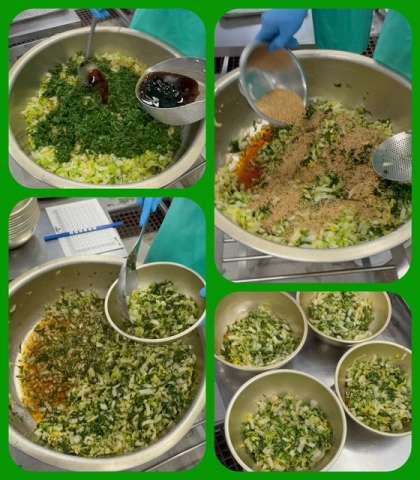 「きくなとはくさいのごまあえ」は、ボイルしたきくなとはくさいを混ぜ合わせ、砂糖、薄口しょうゆで作ったタレをかけ、いりごまをふり、あえます。