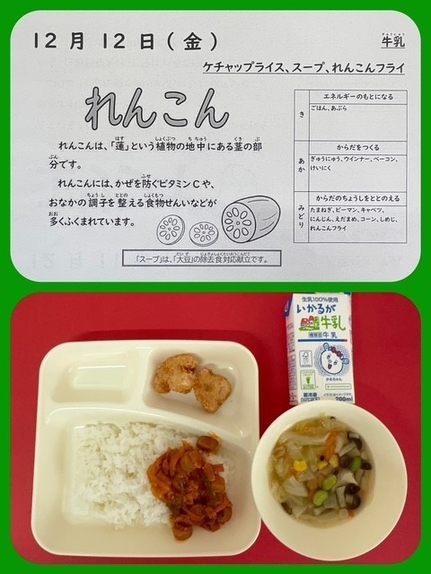 「ケチャップライス」は、ウインナー、ベーコン、たまねぎ、ピーマンをいため、ケチャップ、ウスターソース、塩、カレー粉で味つけします。配食時にごはんの上にかけて、喫食時に混ぜ合わせます。